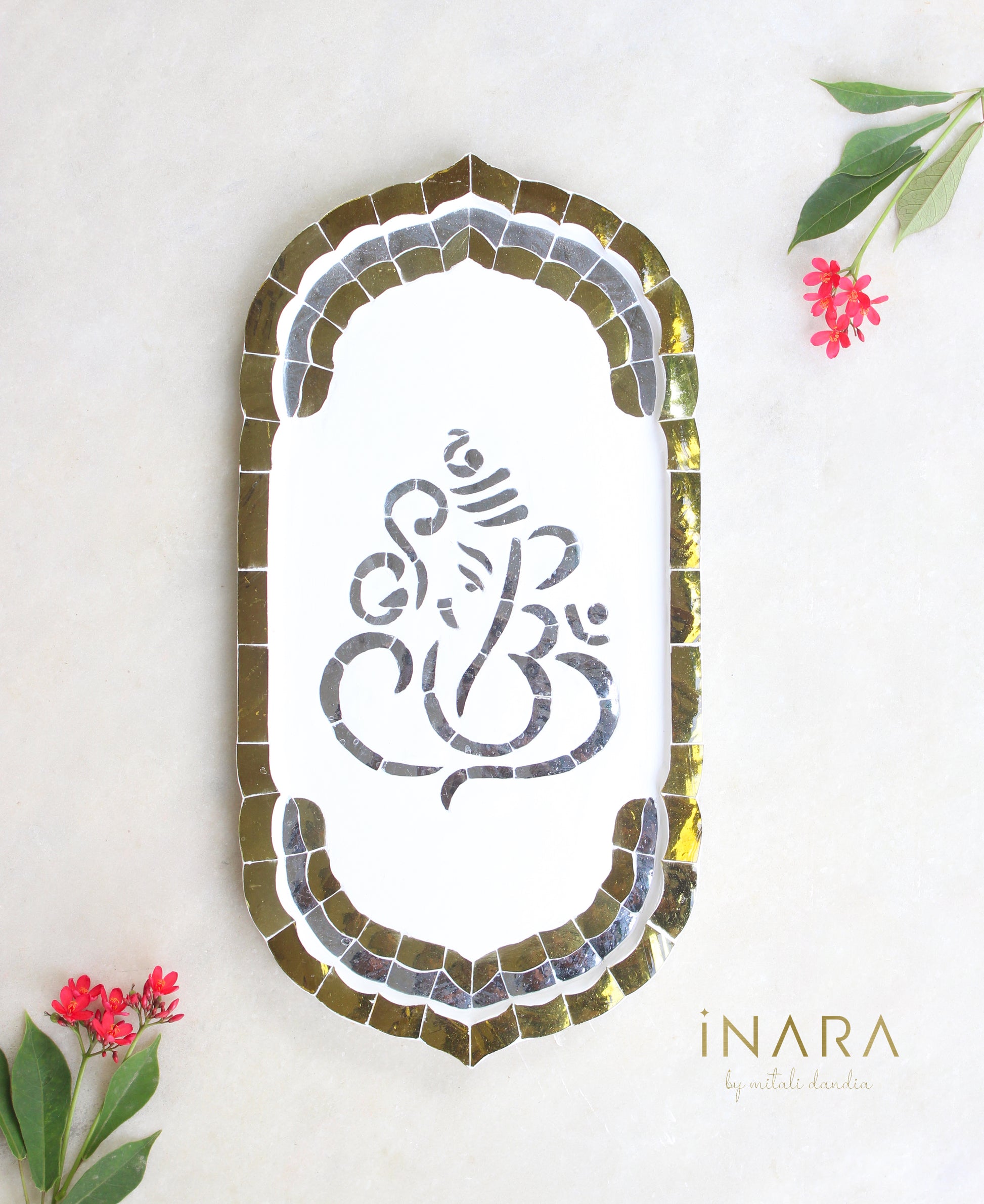 Inspired by the sacred elegance of Indian temple architecture, this handcrafted artwork features a serene Lord Ganesh form rendered in luminous Thikri mirror inlay, set within an arched temple silhouette made from hand-cut reflective glass.