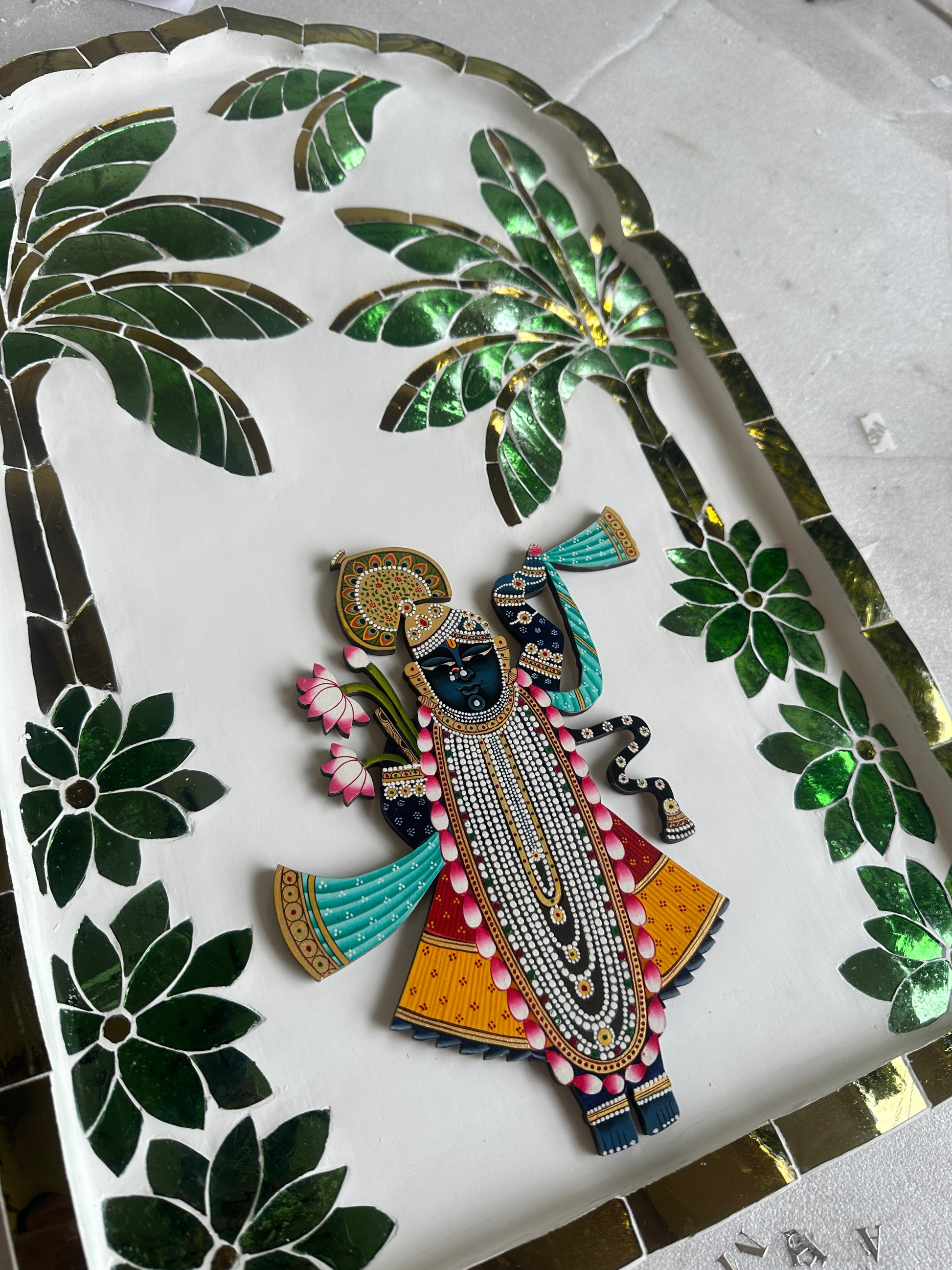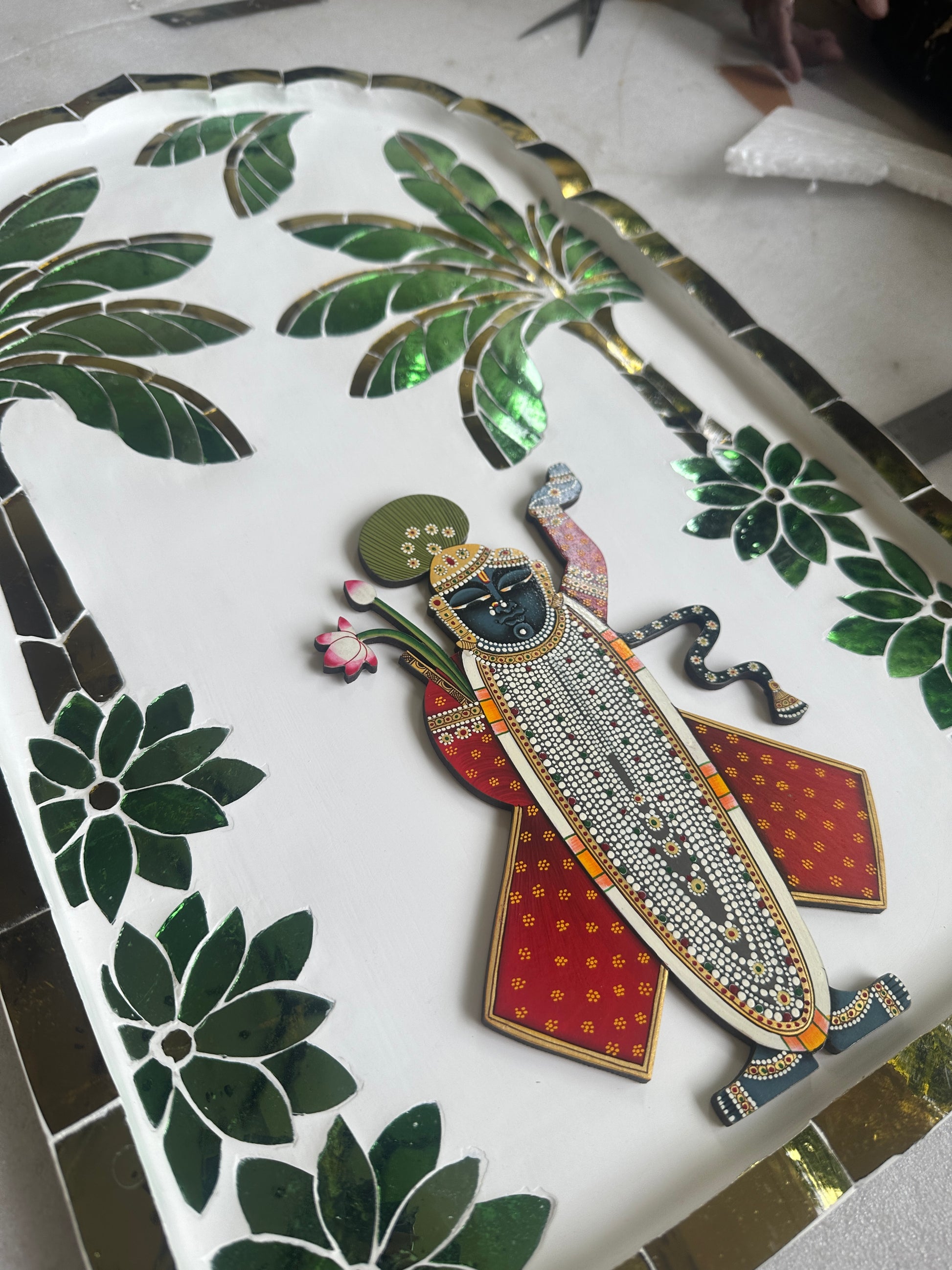 At the centre stands a hand-painted Shrinath Ji cutout, created in the classical Pichwai style and finished with exquisite detailing. Surrounding this sacred form is a luminous Thikri banana leaf pattern, where each mirror shard is hand-cut and hand-laid by skilled artisans of Rajasthan. As light moves across the surface, the mirrors respond with a gentle radiance - allowing the artwork to shimmer and transform from every angle, creating depth, movement, and quiet grandeur.